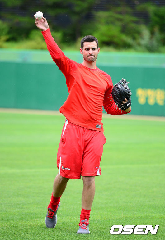 9일 오후 인천 문학구장에서 열린 '2014 한국야쿠르트 세븐 프로야구' SK 와이번스와 KIA 타이거즈의 경기에 앞서 SK 새 용병 밴 와트가 캐치볼을 하고 있다.