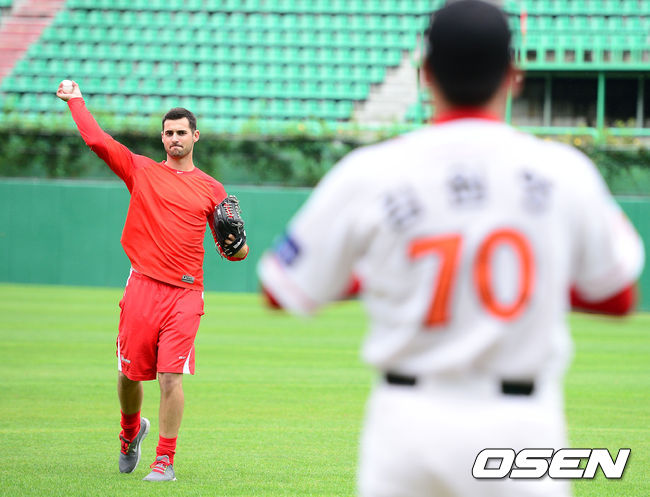 9일 오후 인천 문학구장에서 열린 '2014 한국야쿠르트 세븐 프로야구' SK 와이번스와 KIA 타이거즈의 경기에 앞서 SK 새 용병 밴 와트가 김원형 코치와 캐치볼을 하고 있다.