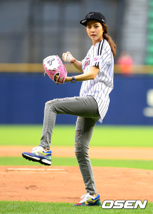 경기에 앞서 가수 박지윤이 시구를 하고 있다.