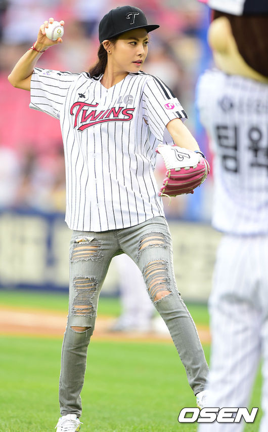 경기에 앞서 가수 박지윤이 시구를 하고 있다.