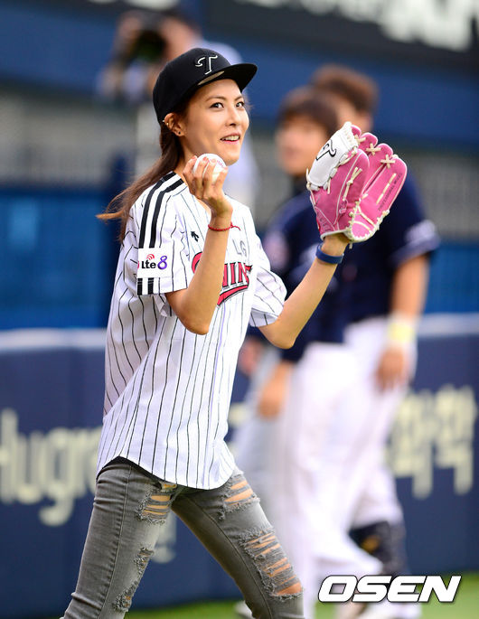 경기에 앞서 시구자로 나선 가수 박지윤이 팬들에 인사를 하며 미소짓고 있다.