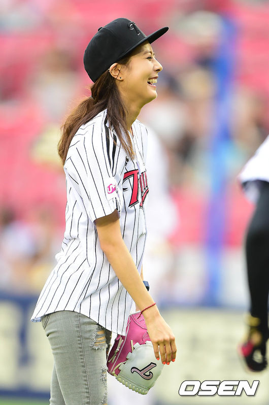 경기에 앞서 시구를 맡은 가수 박지윤이 시구를 마치고 밝게 웃고 있다.
