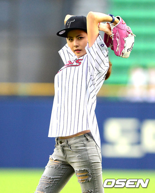 경기에 앞서 가수 박지윤이 시구를 하고 있다.