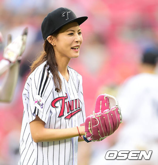 경기에 앞서 시구를 맡은 가수 박지윤이 시구를 마치고 밝게 웃고 있다.