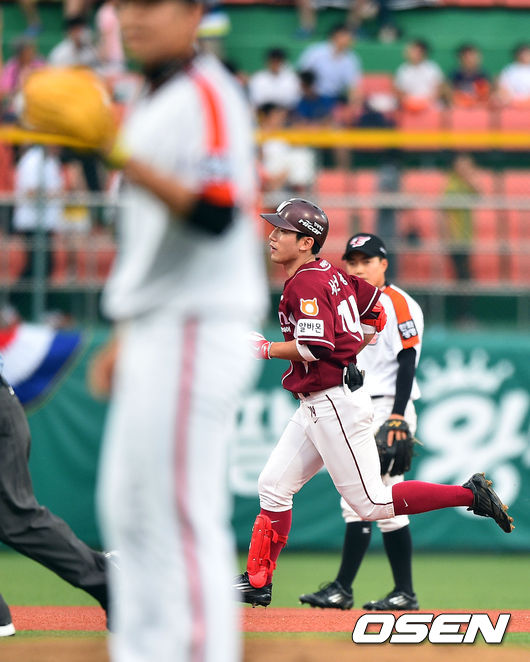 9일 오후 충북 청주구장에서 열린 2014 한국야쿠르트 세븐 프로야구 한화 이글스와 넥센 히어로즈의 경기, 1회초 넥센 선두타자 서건창이 선취 솔로홈런을 날리고 베이스를 돌고 있다.