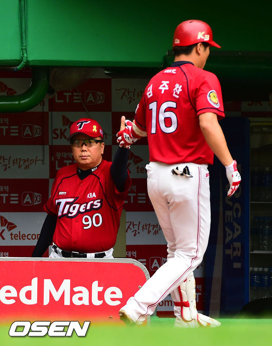 9일 오후 인천 문학구장에서 열린 '2014 한국야쿠르트 세븐 프로야구' SK 와이번스와 KIA 타이거즈의 경기, 1회초 솔로포를 날린 김주찬이 덕아웃에서 선동렬 감독과 하이파이브를 나누고 있다.