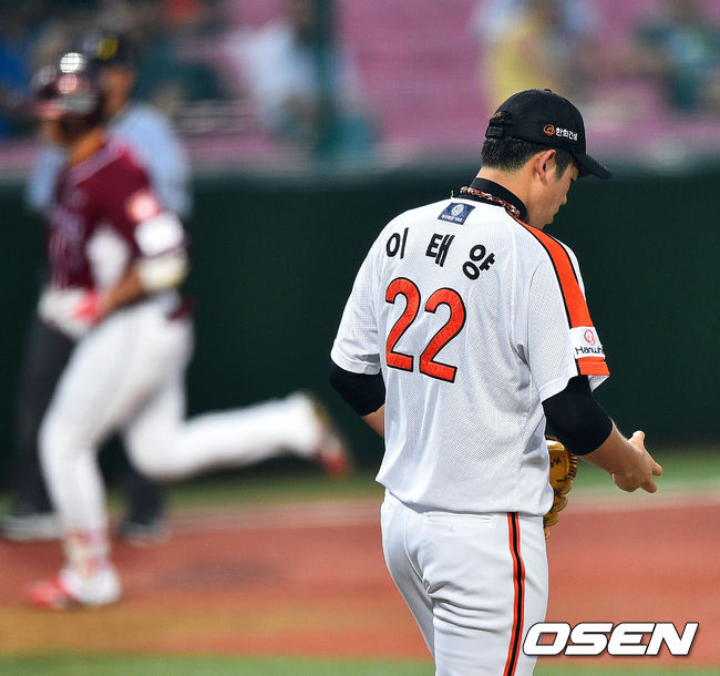 8일 오후 충북 청주구장에서 열린 2014 한국야쿠르트 세븐 프로야구 한화 이글스와 넥센 히어로즈의 경기,2회초 한화 이태양 선발투수가 넥센 강정호에게 3점 홈런을 허용하자 아쉬워하고 있다.
