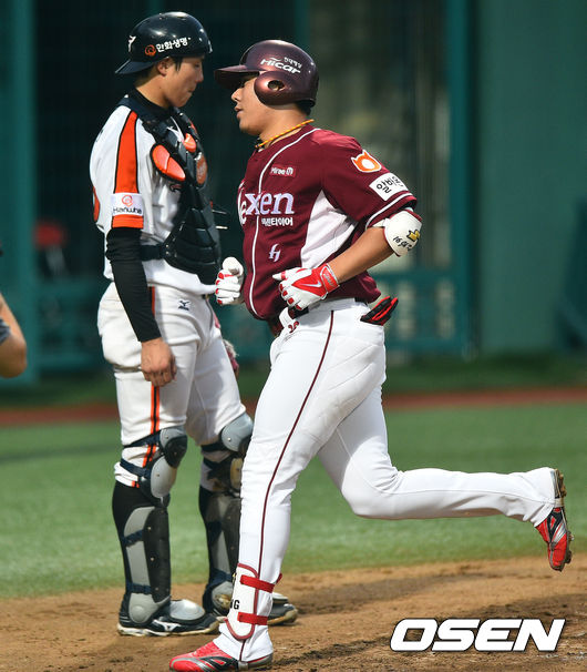 8일 오후 충북 청주구장에서 열린 2014 한국야쿠르트 세븐 프로야구 한화 이글스와 넥센 히어로즈의 경기,2회초 1사 2,3루 넥센 강정호가 3점 홈런을 날리고 홈을 밟고 있다.