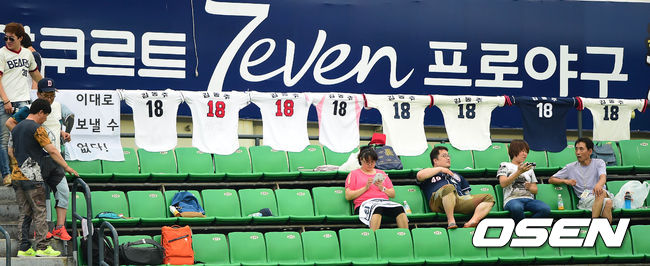 경기중 잠실야구장 외야석에 두산 김동주의 유니폼들이 걸려 있다.