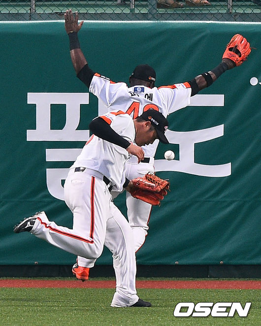 8일 오후 충북 청주구장에서 열린 2014 한국야쿠르트 세븐 프로야구 한화 이글스와 넥센 히어로즈의 경기,2회초 1사 1,3루 넥센 박병호의 1타점 적시타때 한화 최진행 중견수와 피에가 타구를 놓치고 있다.