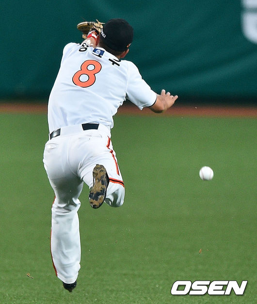 8일 오후 충북 청주구장에서 열린 2014 한국야쿠르트 세븐 프로야구 한화 이글스와 넥센 히어로즈의 경기,2회초 한화 정근우 2루수가 넥센 선두타자 윤석민의 타구를 놓치고 있다.