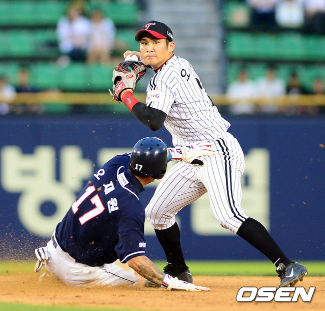 5회초 무사 1루에서 LG 오지환이 두산 김재호의 2루땅볼에 오재원을 포스아웃시키고 1루로 송구하고 있다.