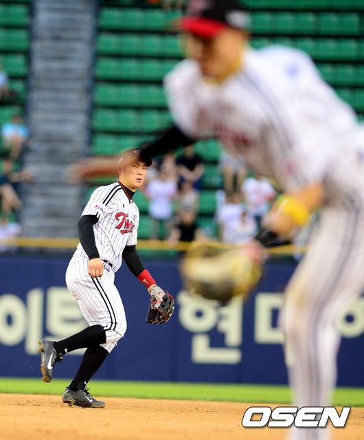 5회초 무사 1루에서 LG 오지환이 두산 김재호의 2루땅볼에 오재원을 포스아웃시키고 1루로 송구하며 볼을 바라보고 있다.