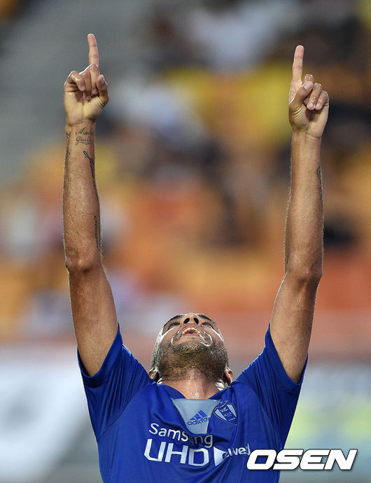 전반 수원 로저가 골을 성공시키고 환호하고 있다.