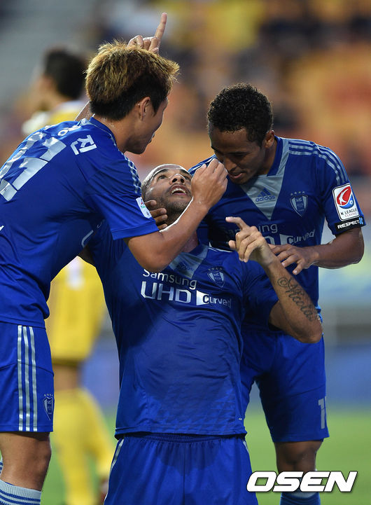 전반 수원 로저가 골을 성공시키고 동료들과 환호하고 있다.