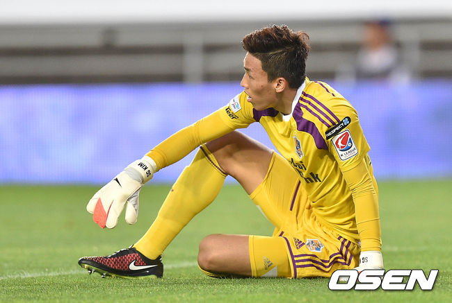 전반 수원 산토스에게 골을 허용한 울산 골키퍼 김승규가 아쉬운 표정을 짓고 있다.