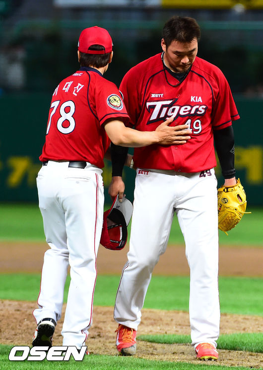 9일 오후 인천 문학구장에서 열린 '2014 한국야쿠르트 세븐 프로야구' SK 와이번스와 KIA 타이거즈의 경기, 5회말 2사 1,3루 KIA 선발 김진우가 마운드를 내려가고 있다.