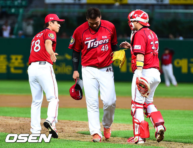 9일 오후 인천 문학구장에서 열린 '2014 한국야쿠르트 세븐 프로야구' SK 와이번스와 KIA 타이거즈의 경기, 5회말 2사 1,3루 KIA 선발 김진우가 마운드를 내려가고 있다.