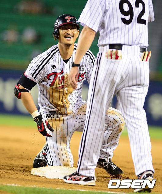 6회말 무사 1루에서 LG 박용택이 좌전안타를 날리고 귀루하며 세이프되고 있다.