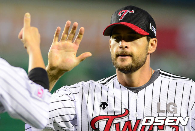 6회초 2사 2루에서 LG 스나이더가 두산 오재일의 타구를 슬라이딩하며 잡아내고 더그아웃으로 향하며 우규민의 격려를 받고 있다.