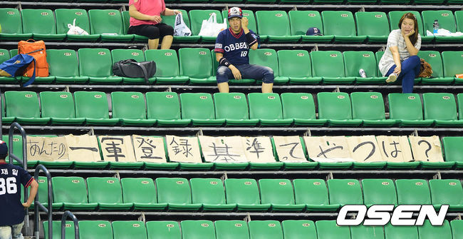 경기중 잠실야구장 외야석에 두산 김동주 팬들이 송일수 감독에게 일본어로 질문을 하고 있다.