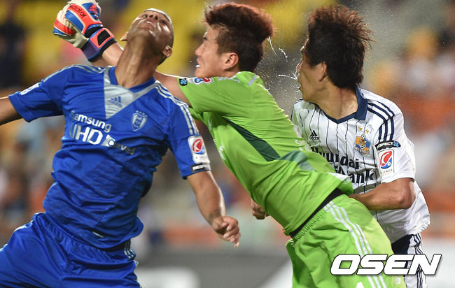 후반 울산 유준수가 골중볼 다툼 중 수원 골키퍼 노동건과 충돌하고 있다.