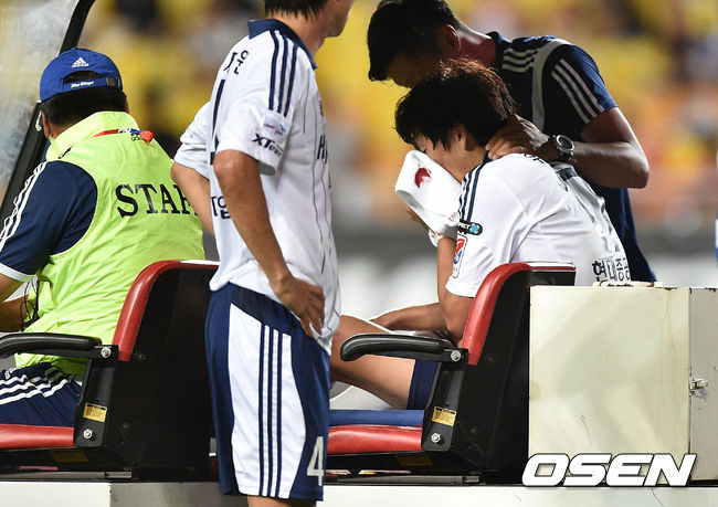 후반 울산 유준수가 골중볼 다툼 중 수원 골키퍼 노동건과 충돌해 부상을 당하며 교체되어 나가고 있다.