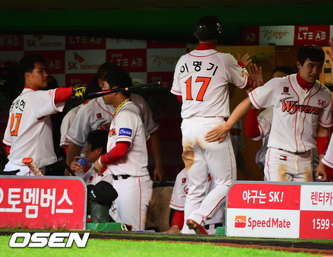 9일 오후 인천 문학구장에서 열린 '2014 한국야쿠르트 세븐 프로야구' SK 와이번스와 KIA 타이거즈의 경기, 5회말 1사 1,3루 SK 최정의 적시타로 홈을 밟은 이명기가 덕아웃에서 동료들과 하이파이브를 나누고 있다.