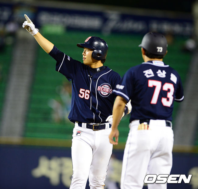8회초 무사 1,3루에서 두산 박건우가 1타점 적시타를 날리며 기뻐하고 있다.