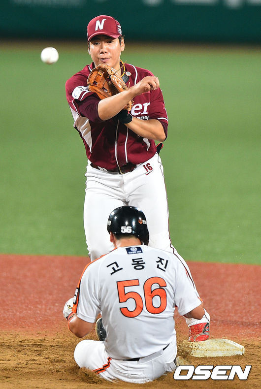 9일 오후 충북 청주구장에서 열린 2014 한국야쿠르트 세븐 프로야구 한화 이글스와 넥센 히어로즈의 경기, 7회말 1사 1루 한화 정범모의 병살타때 넥센 강정호 유격수가 1루 주자 고동진을 포스아웃 시킨뒤 1루로 송구하고 있다.