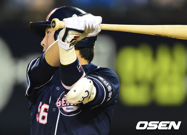 8회초 무사 주자 1,3루 두산 박건우가 3루 주자 김재호를 불러들이는 1타점 적시타를 치고 있다.