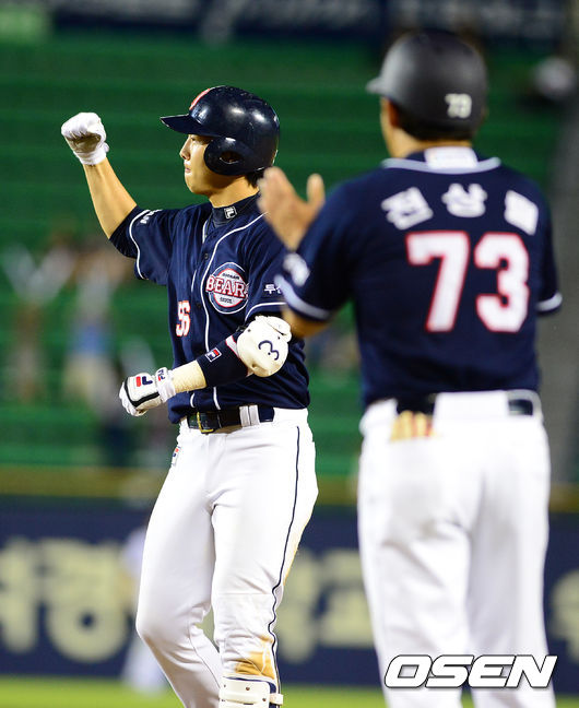 8회초 무사 1,3루에서 두산 박건우가 1타점 적시타를 날리며 기뻐하고 있다.