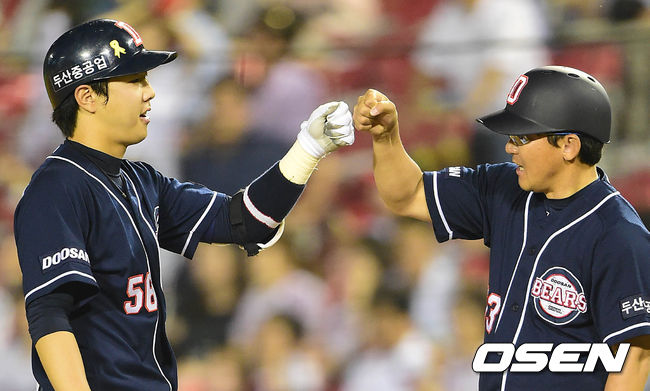 8회초 무사 주자 1,3루 두산 박건우가 3루 주자 김재호를 불러들이는 적시타를 치고 1루에서 좋아하고 있다.