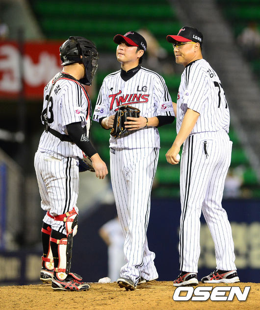 8회초 무사 1,3루에서 LG 우규민이 두산 박건우에 1타점 적시타를 허용하며 마운드를 내려가고 있다.
