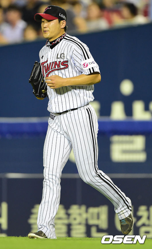 8회초 무사 1,3루 LG 선발 투수 우규민이 내려 가고 신재웅이 마운드로 오르고 있다.