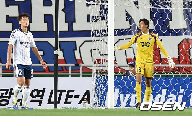 후반 수원 김은선에게 골을 허용한 울산 골키퍼 김승규가 아쉬운 표정을 짓고 있다.