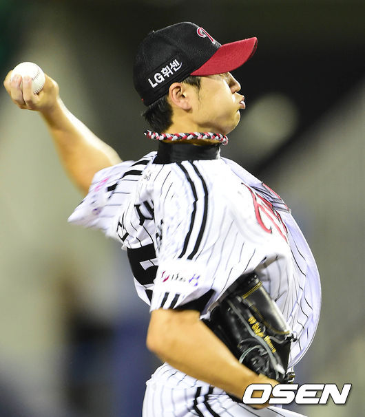 8회초 무사 주자 1,3루 LG 신재웅이 마운드에 올라와 힘차게 공을 던지고 있다.