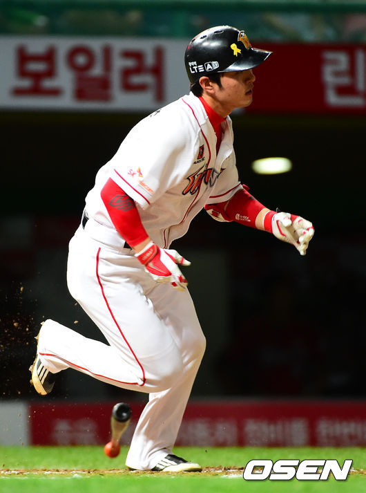 9일 오후 인천 문학구장에서 열린 '2014 한국야쿠르트 세븐 프로야구' SK 와이번스와 KIA 타이거즈의 경기, 7회말 1사 1,2루 SK 김성현이 1타점 적시타를 때리고 1루로 달리고 있다.