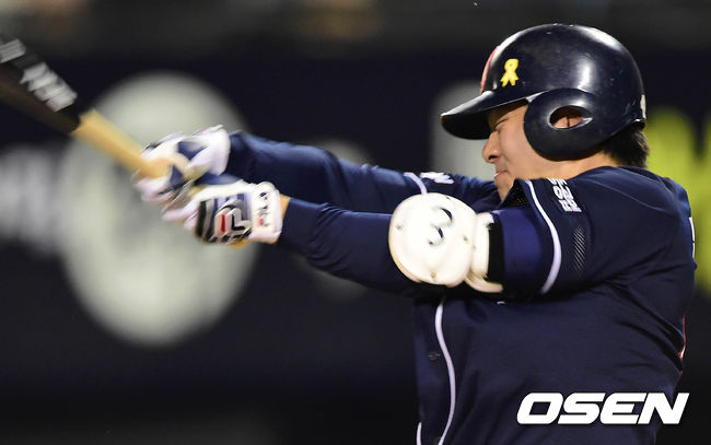 8회초 무사 주자 1,3루 두산 민병헌이 3루 주자를 불러들이는 병살타를 치고 있다.