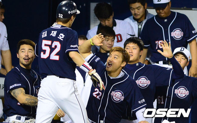 8회초 무사 1,3루에서 두산 홍성흔을 비롯한 동료선수들이 민병헌의 내야땅볼로 동점에 성공하자 기뻐하고 있다.