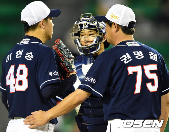 8회말 2사 주자 1,2루 두산 투수코치 권명철이 마운드를 방문해 이현승을 체크하고 있다.
