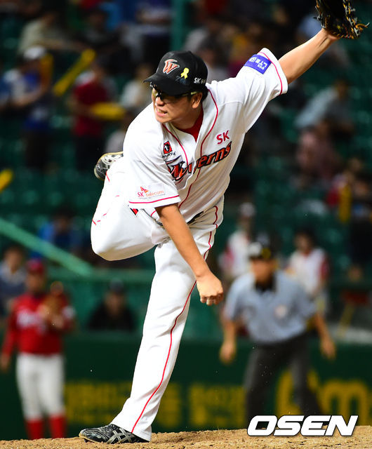 9일 오후 인천 문학구장에서 열린 '2014 한국야쿠르트 세븐 프로야구' SK 와이번스와 KIA 타이거즈의 경기, 8회초 2사 1,2루 SK 전유수가 힘차게 공을 뿌리고 있다.