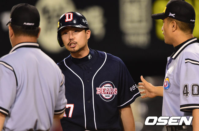 9회초 1사 주자 2루 두산 오재원이 타석에 들어서 LG 포수 최경철과 신경전을 벌이는 중 오재원이 심판들에게 이야기하고 있다.