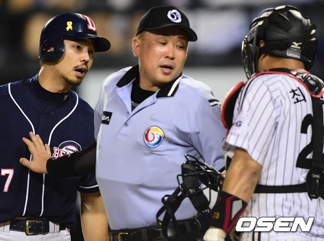 9회초 1사 주자 2루 두산 오재원이 타석에 들어서 LG 포수 최경철과 신경전을 벌이고 있다.
