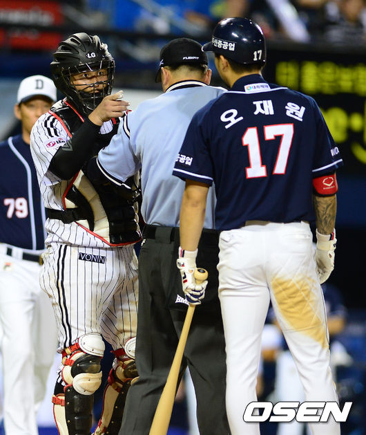 9회초 1사 2루에서 LG 최경철과 두산 오재원이 신경전을 벌이고 있다. 이로 인해 벤치 클리어링이 잠시 일어났다.