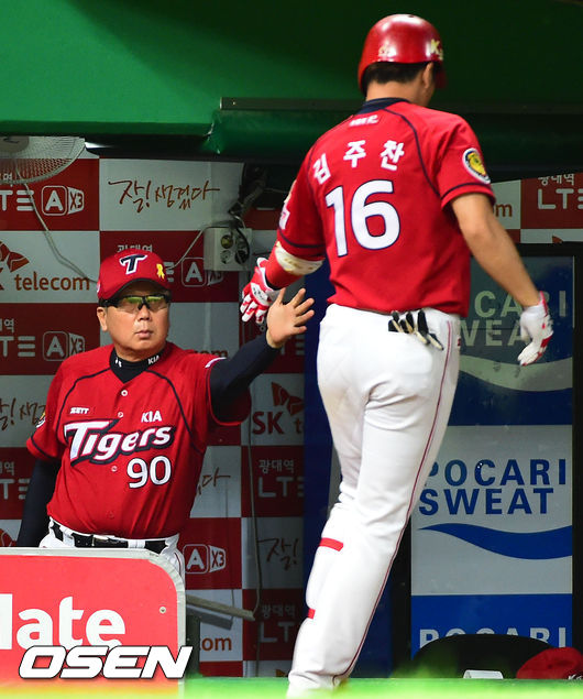 9일 오후 인천 문학구장에서 열린 '2014 한국야쿠르트 세븐 프로야구' SK 와이번스와 KIA 타이거즈의 경기, 9회초 1사 주자없는상황에서 솔로포를 날린 KIA 김주찬이 덕아웃에서 선동렬 감독과 하이파이브를 나누고 있다.