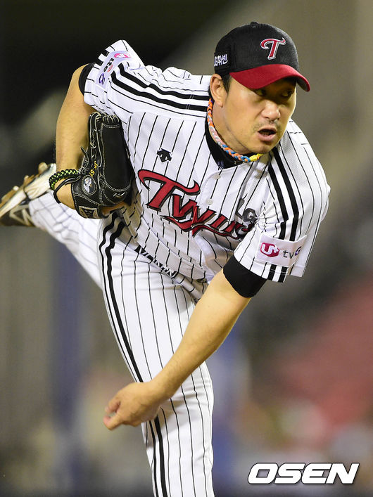 10회초 1사 주자 없는 상황, LG 투수 봉중근이 마운드에 올라 힘차게 공을 던지고 있다.