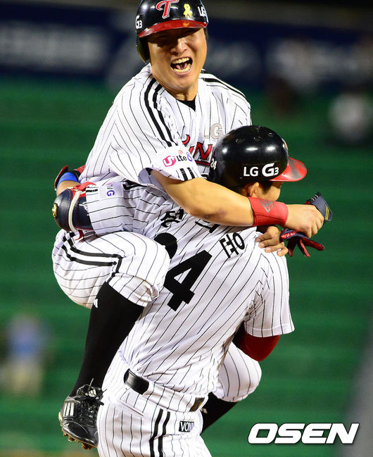 경기후 LG 이진영이 끝내기 안타를 날린 정의윤과 승리를 기뻐하고 있다. / jpnews@osen.co.kr