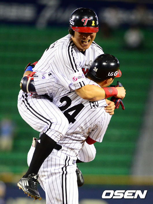 경기후 LG 이진영이 끝내기 안타를 날린 정의윤과 승리를 기뻐하고 있다. / jpnews@osen.co.kr