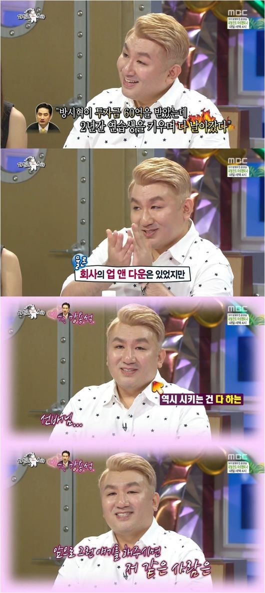 방시혁은 9일 방송된 MBC 예능프로그램 ‘황금어장-라디오스타’에서 강용석이 JTBC ‘썰전’에서 “방시혁이 투자금 60억 원을 날렸다”고 말한 것에 대해 “그런 일이 없다”고 반박했다.